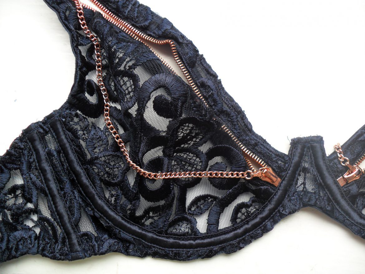 Unfortunately, the zips turned out to be the reason I sent this set back. There were two loose teeth – one on the bra and one on the brief – that were continually catching as I zipped and unzipped the pieces to take these photos. If I’d kept the lingerie and found myself having to tug on these again and again, I’m sure it wouldn’t have been long before they broke completely. The zips also had a not-so-flattering effect on the shape of the cups. The bottom half of the cup fit fine, but the thick, inflexible line of the zip dug in when closed and I ended up with ‘quadboob’.