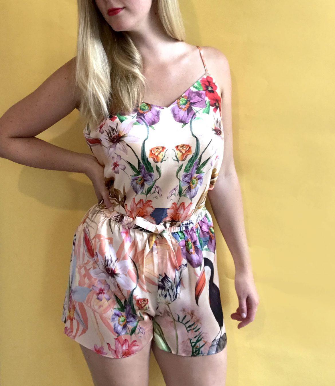 Named Eden, the camisole and shorts set* features a vibrant, tropical print and is made from 100% silk satin fabric. I’ve spoken before (multiple times, I’m sure!) about my love of digitally-printed fabrics – there’s a wonderful depth and richness to the imagery, which I could stare at for ages to admire all of its details. Not just your typical floral, this print also features dragonflies, a frog and more hiding amongst its petals. It’s a little bit whimsical, and a little bit magical too.