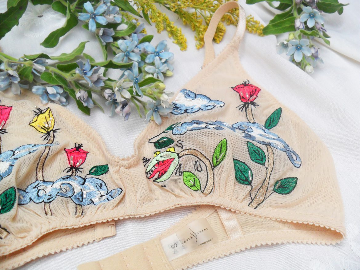 As always, I am blown away by the level of detail in this Love & Swans lingerie set. What may from a distance appear to be a print is actually an embroidery, which gives it a wonderful depth of texture when seen up close. The colour palette is vibrant, and unexpectedly thorough – like the way Cupid’s body includes subtle pink shading.